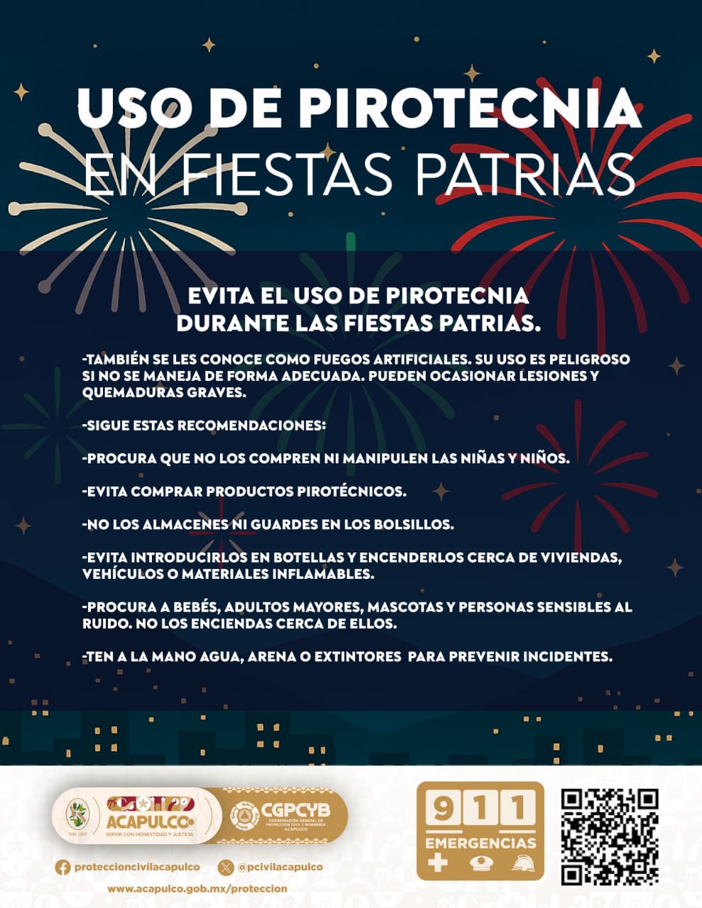 Acapulco, Gro., 15 de septiembre de 2025.- Con el propósito de proteger la seguridad de la ciudadanía durante las celebraciones patrias, el Gobierno de Acapulco llama a la población a abstenerse de utilizar pirotecnia.