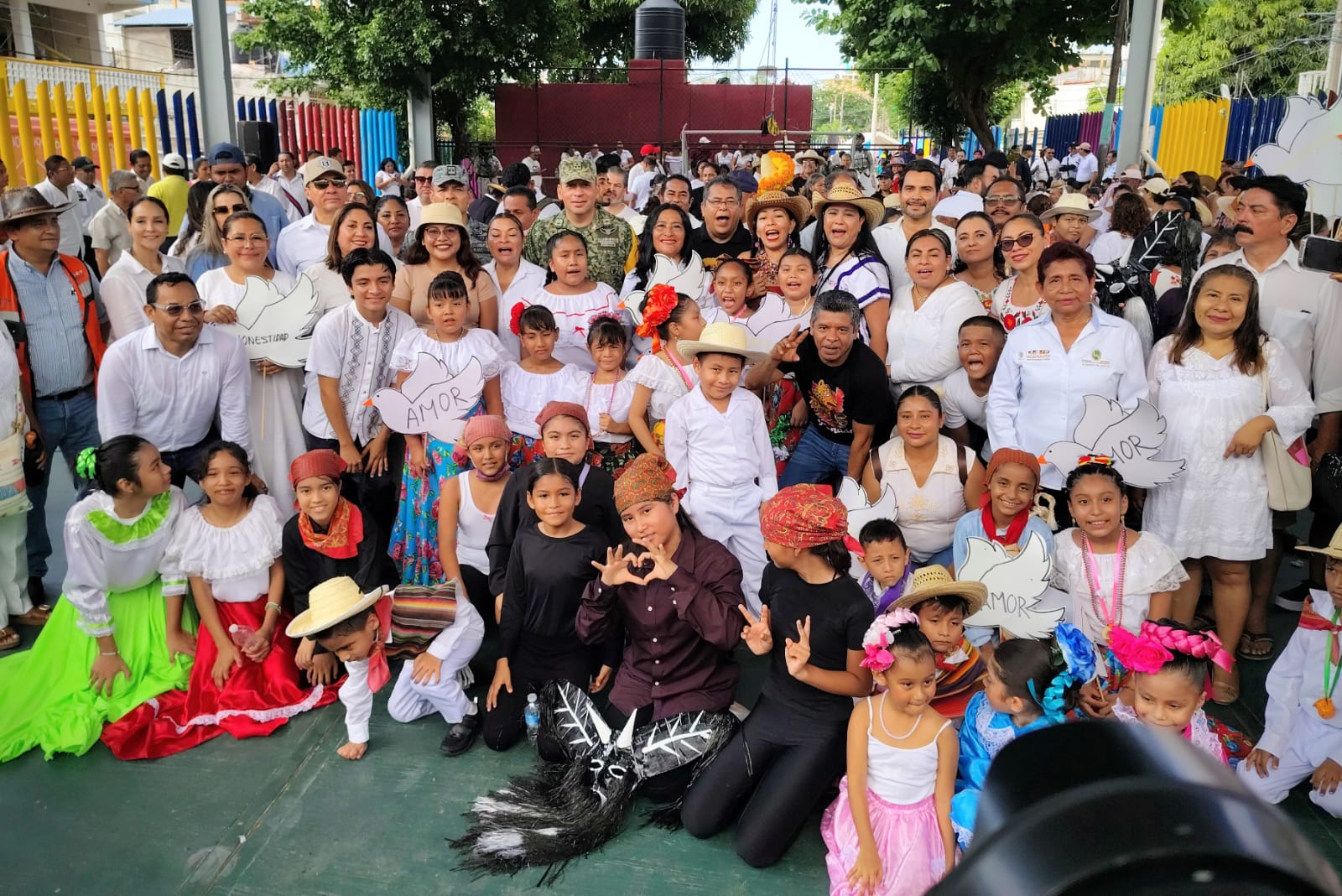 En la cancha de calle Durango, de la colonia Progreso, se desarrolló el programa “Paz, Honestidad y Corazón para la Reconstrucción de Acapulco”, donde la alcaldesa convivió con estudiantes de nivel primaria que participaron en el Pendón y reflexionó sobre la importancia de preservar la historia y la identidad cultural que fortalecen el orgullo de pertenecer a Guerrero.