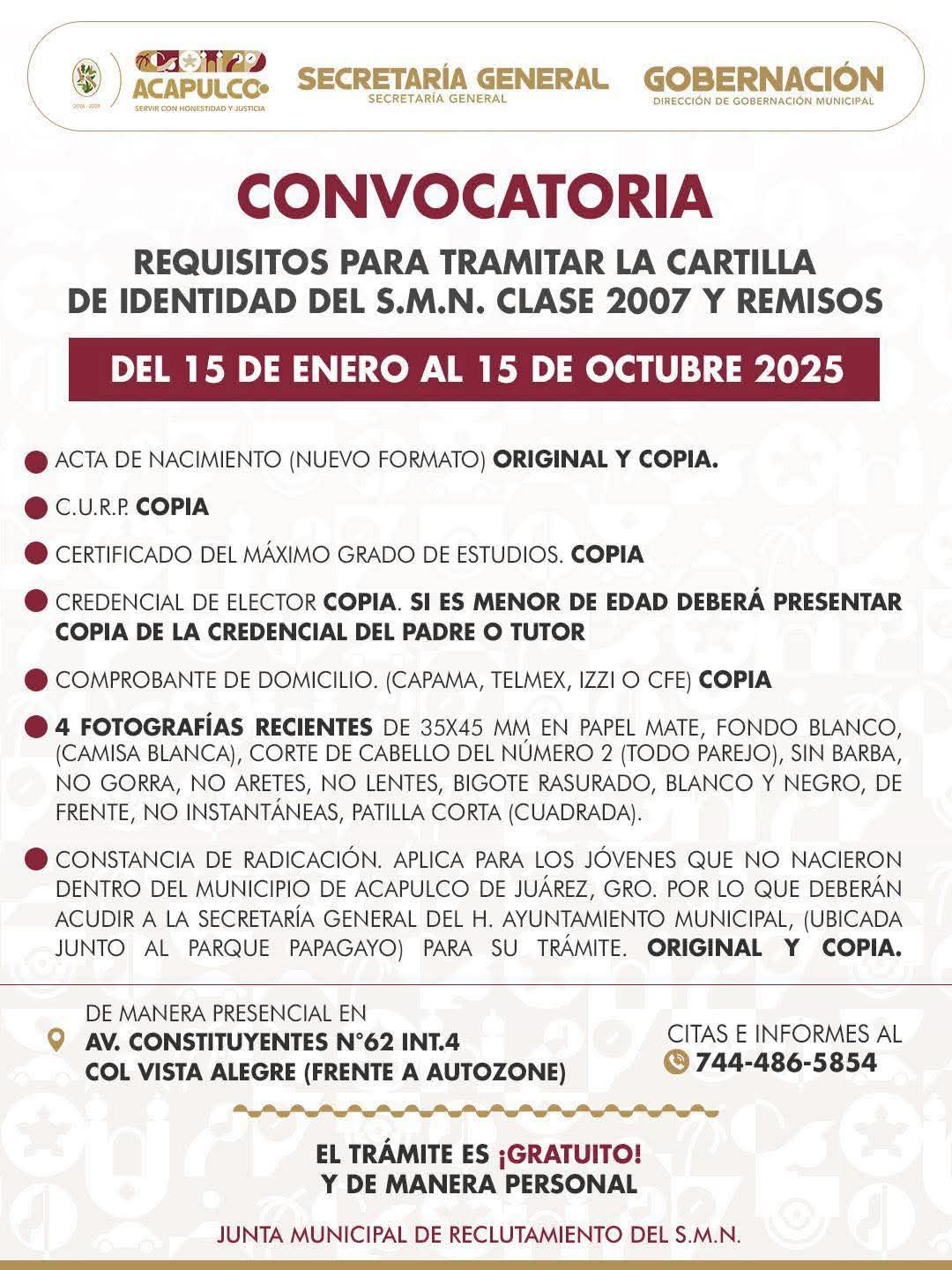 Acapulco, Gro., 05 de octubre de 2025.- El Gobierno Municipal que encabeza Abelina López Rodríguez, a través de la Dirección de Gobernación, invita a los jóvenes de la clase 2007 y remisos a iniciar el trámite de la Cartilla de Identidad del Servicio Militar Nacional (SMN).