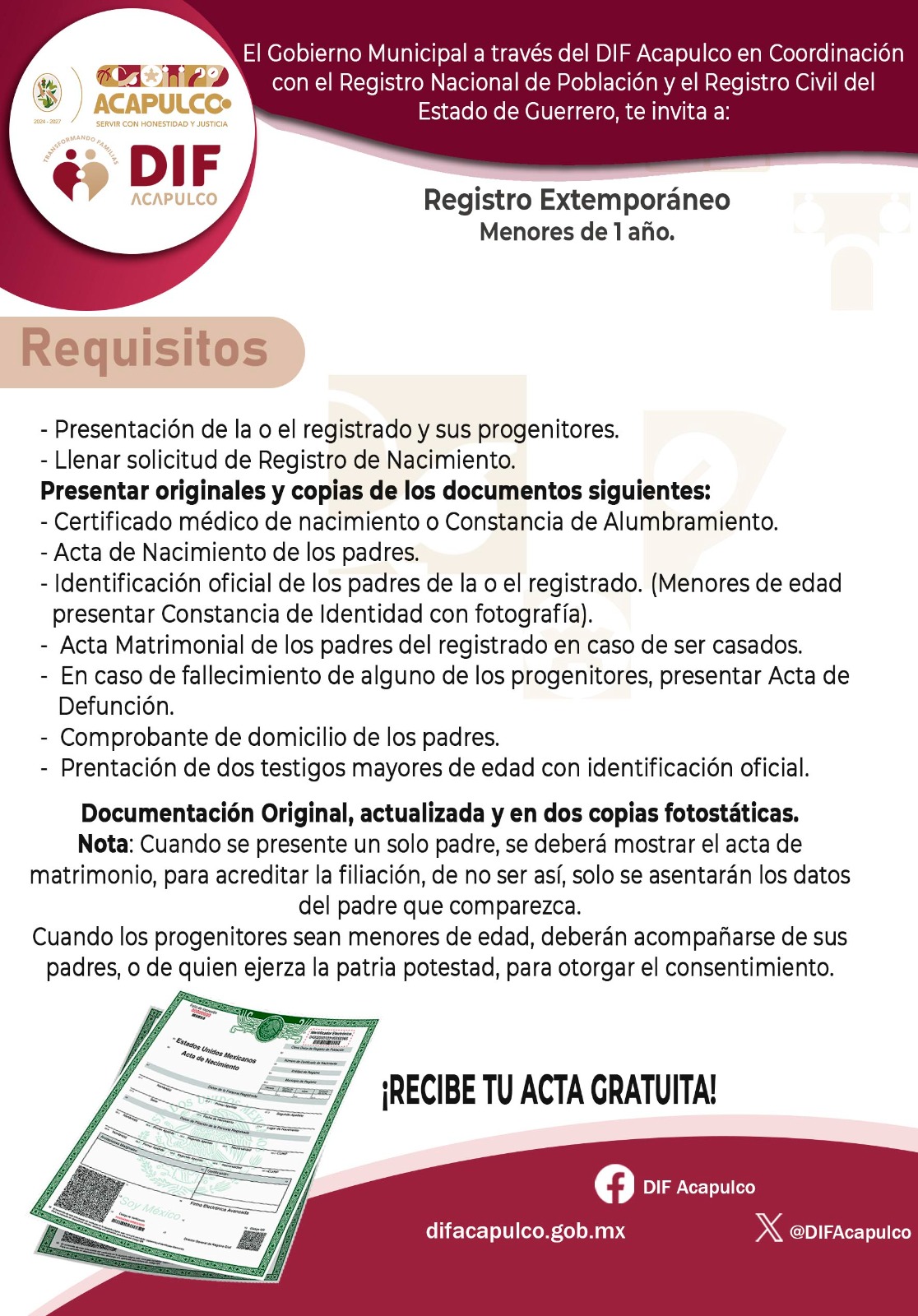 Acapulco, Gro., 14 de noviembre de 2025.- El Sistema DIF Acapulco convoca a la comunidad a la campaña de registros de nacimiento y extemporáneos dirigida a menores de 0 a 13 años que no han sido registrados, con el propósito de asegurar su derecho a la identidad, en atención a las políticas impulsadas por la alcaldesa Abelina López Rodríguez.