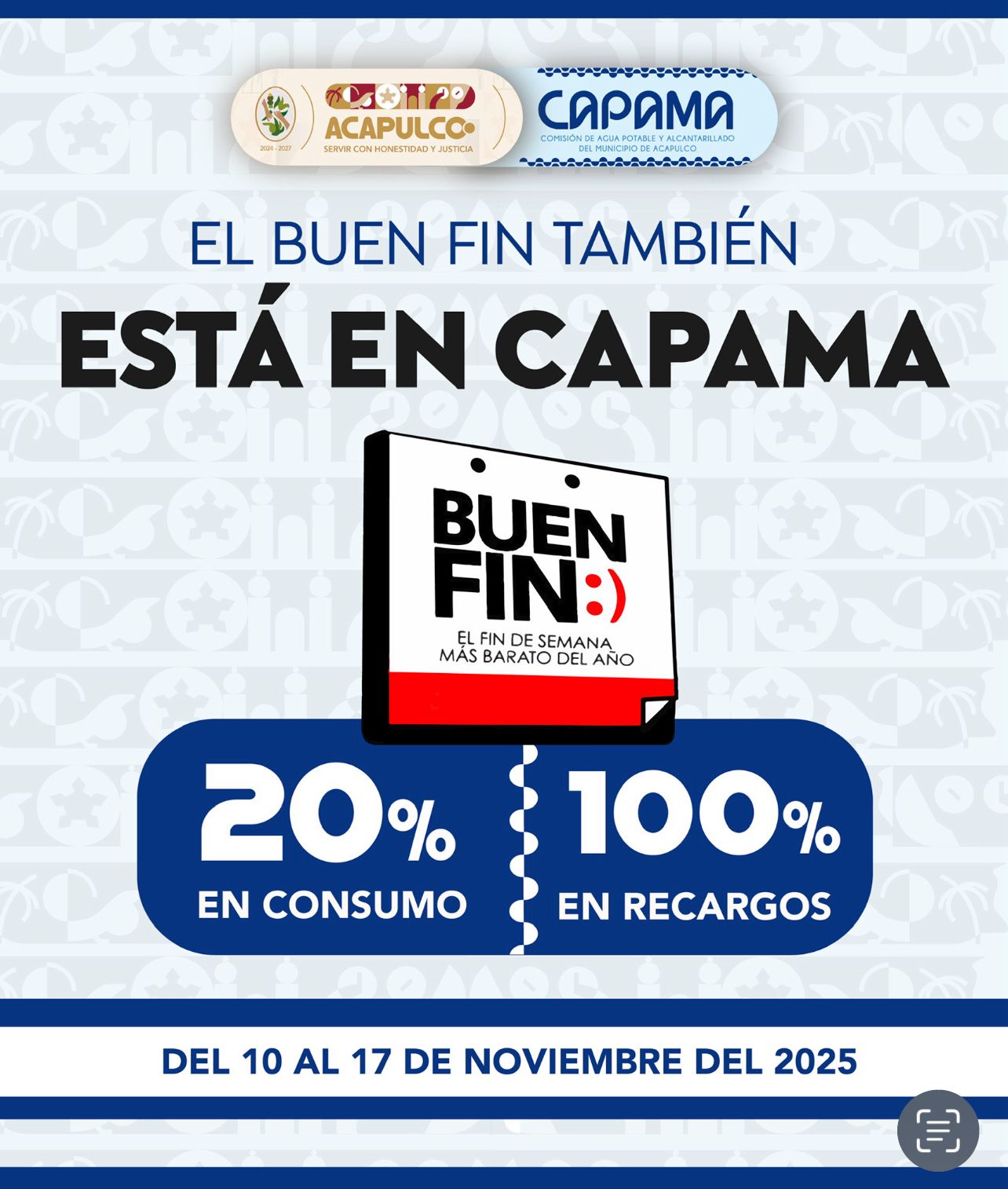 Acapulco, Gro., 07 de noviembre de 2025.- Con el objetivo de que más usuarios con adeudos puedan regularizar su situación y saldar sus cuentas, la Comisión de Agua Potable y Alcantarillado del Municipio de Acapulco (Capama) aplicará un 20 % de descuento en el consumo y condonará el 100 % de los recargos durante el Buen Fin 2025.