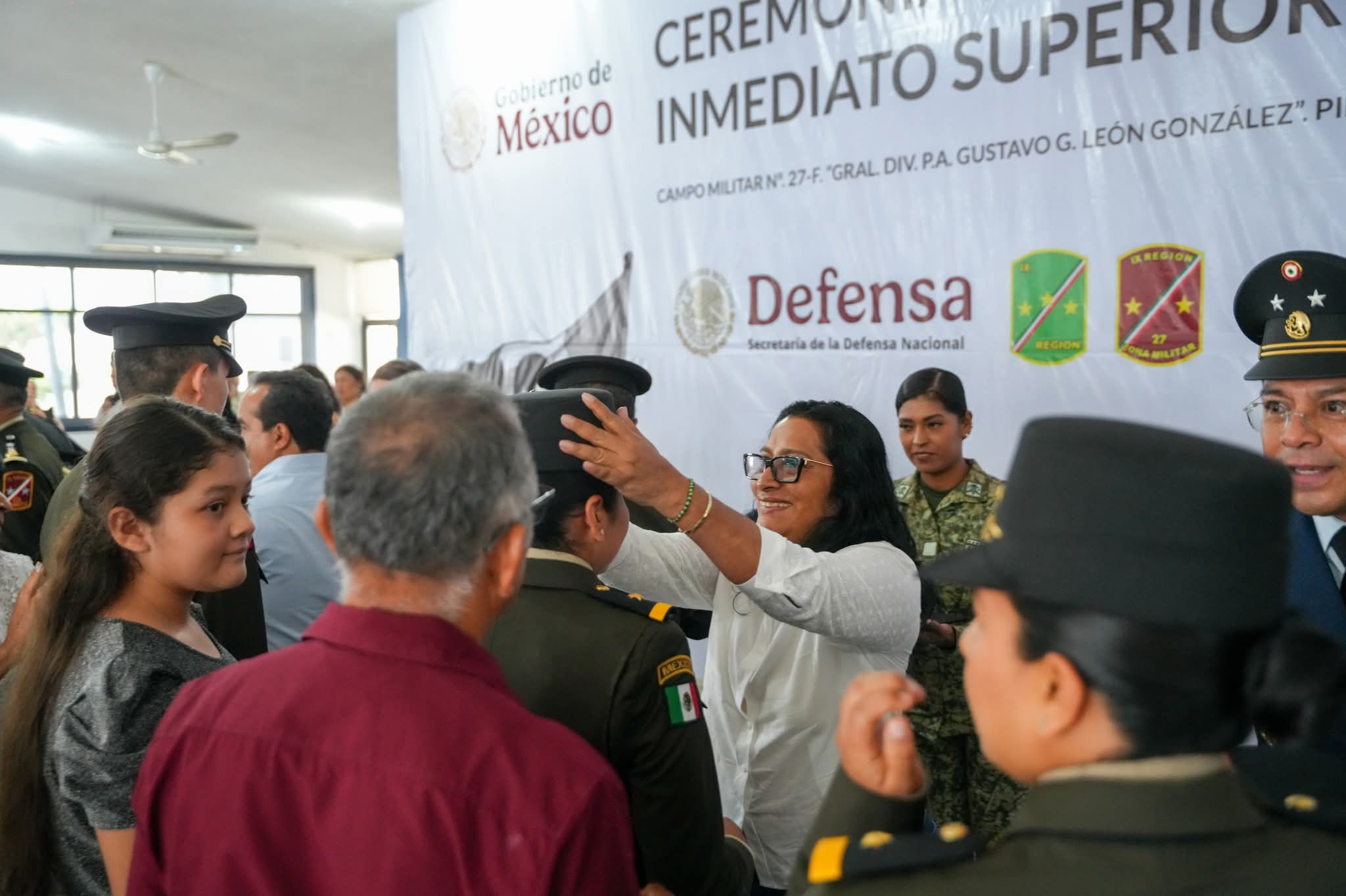 La presidenta municipal acompañó el acto y reafirmó el respaldo del gobierno local a las Fuerzas Armadas y su compromiso con la coordinación institucional. Los mandos ascendidos recibieron sus insignias en un evento que reflejó disciplina, esfuerzo y profesionalismo, resaltando la trayectoria de quienes integran la Promoción General Superior 2025.