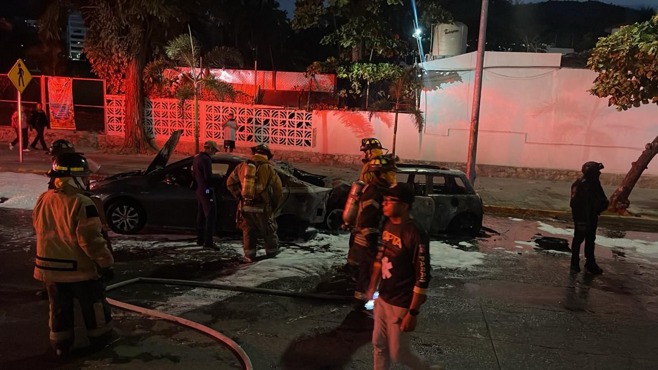 Acapulco, Gro., 26 de diciembre de 2025.- Durante la madrugada de este viernes, el Gobierno Municipal de Acapulco atendió un accidente vehicular ocurrido sobre la avenida Costera Miguel Alemán, a la altura del Club de Golf, donde dos automóviles particulares —un Mini Cooper y un Toyota Yaris— se incendiaron tras un impacto por alcance, lo que generó una rápida movilización de los cuerpos de emergencia.