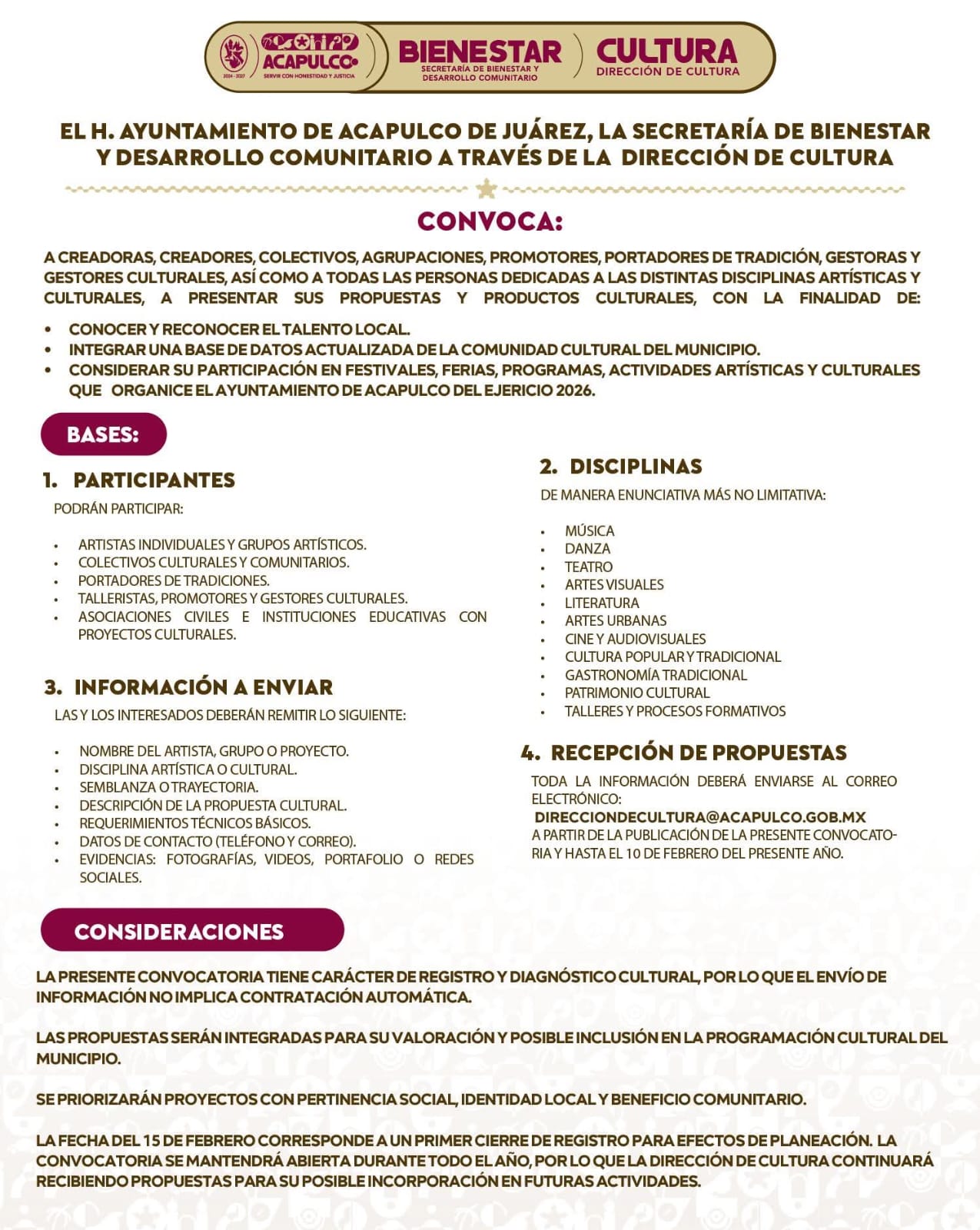 El material se recibirá en el correo electrónico DIRECCIONDECULTURA@ACAPULCO.GOB.MX, a partir de esta publicación y hasta el 10 de febrero de 2026.