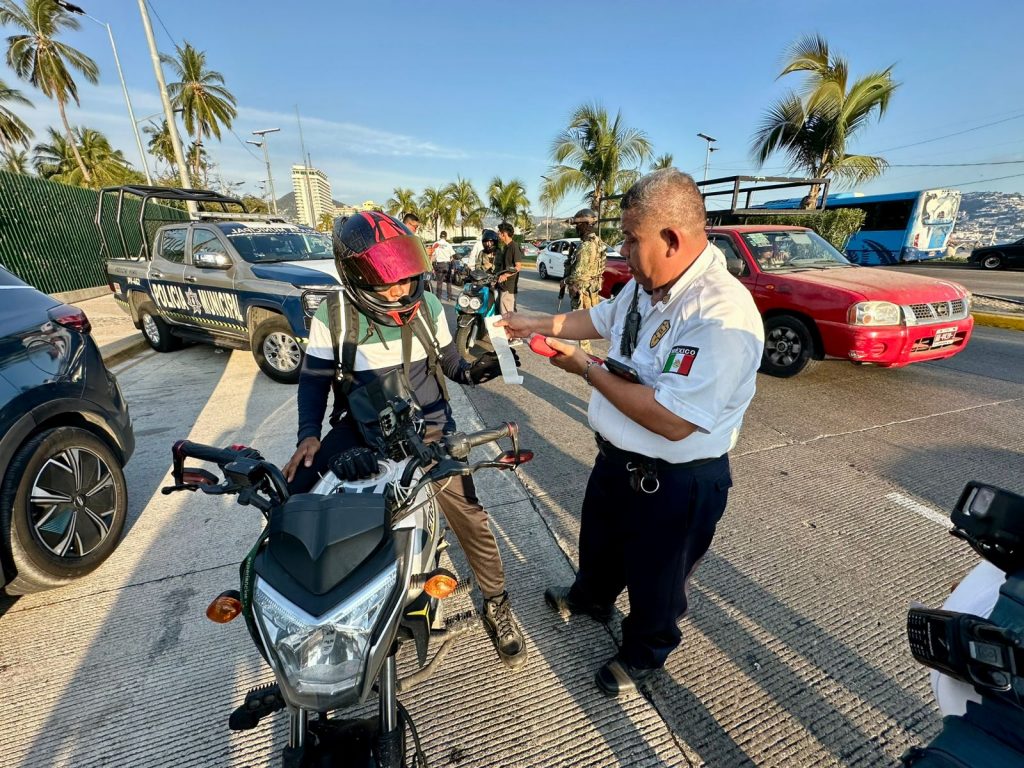 Acapulco, Gro., 24 de enero de 2026.- La Secretaría de Seguridad Pública de Acapulco (SSP) desplegó un operativo para garantizar el uso correcto del casco entre motociclistas y reducir riesgos de accidentes mediante la supervisión del tránsito, la verificación de la portación adecuada del equipo de protección y la orientación a los conductores sobre su importancia para salvaguardar la vida.