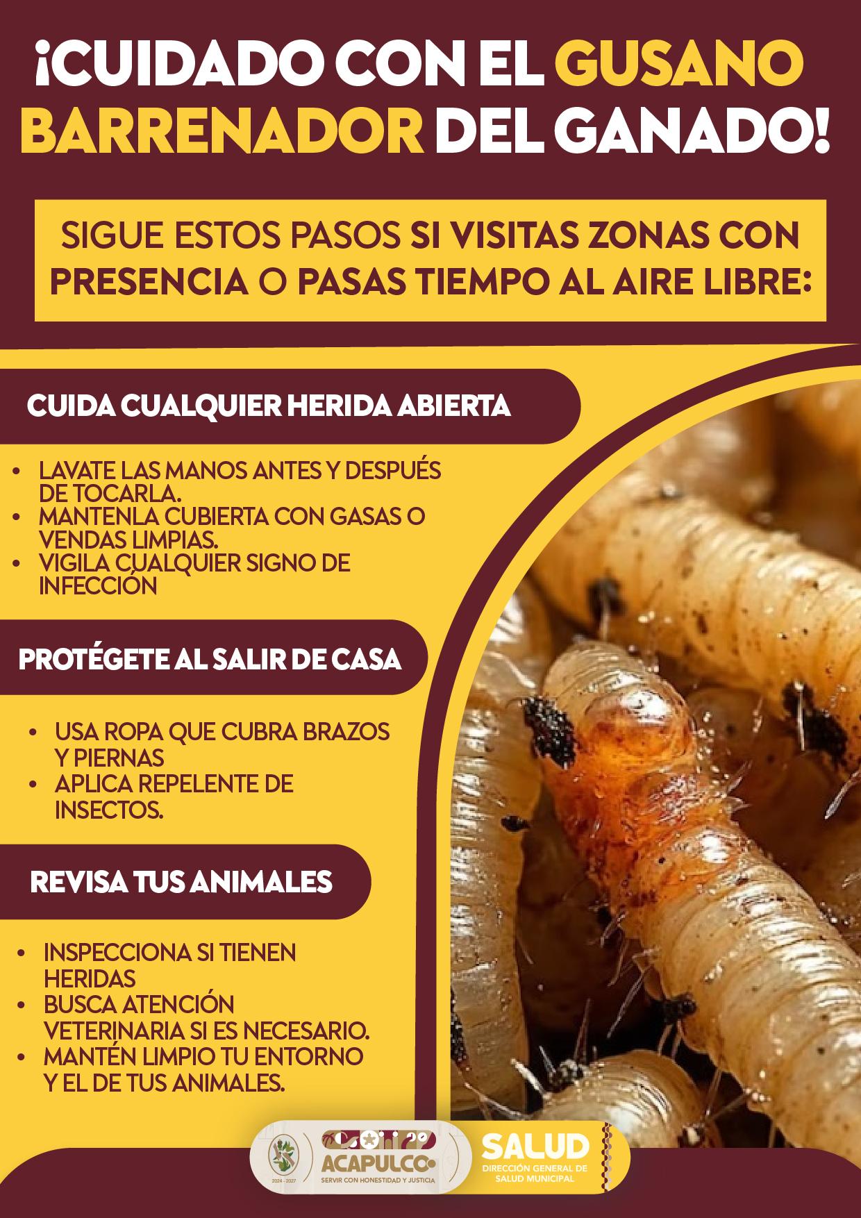 Acapulco, Gro., 05 de febrero de 2026.- La Dirección General de Salud Municipal informó que en Acapulco no existe registro de casos del gusano barrenador en personas y dio a conocer una serie de recomendaciones preventivas dirigidas a la población, con especial atención en el manejo de heridas y en el cuidado de animales domésticos y de producción.
