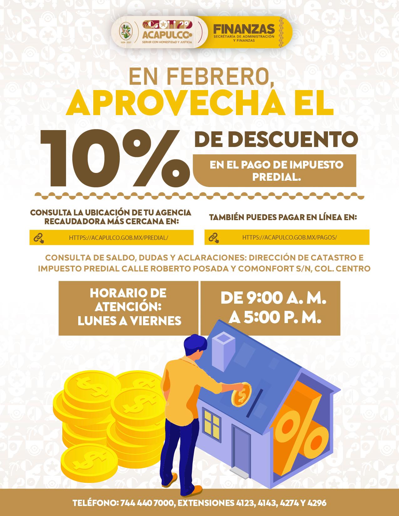 Acapulco, Gro., 13 de febrero de 2026.- El Gobierno Municipal mantiene durante febrero el programa de estímulos fiscales para contribuir a la economía de las familias y del sector comercial, con descuentos directos en el impuesto predial y en licencias de funcionamiento, además del 100 por ciento en multas, recargos y actualizaciones para quienes registren adeudos de años anteriores.