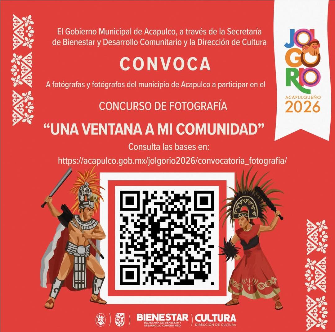 Fotógrafas y fotógrafos podrán participar en el certamen “Una ventana a mi comunidad”, que reconoce la creatividad y la mirada artística que capturan la esencia de Acapulco. Las bases se encuentran disponibles en: https://acapulco.gob.mx/jolgorio2026/convocatoria_fotografia/.