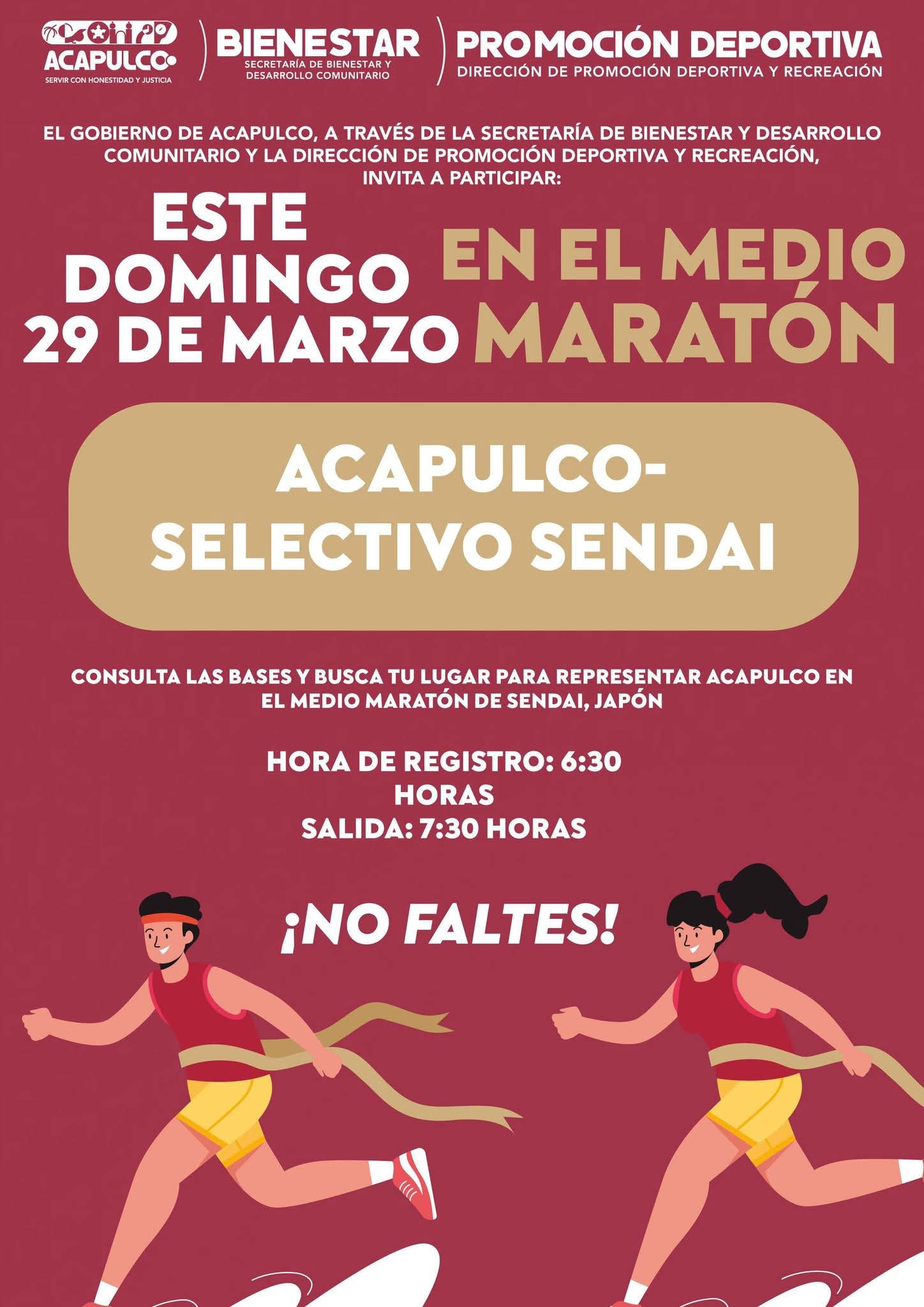 Acapulco, Gro., 28 de marzo de 2026.- Para fomentar la salud, promover la actividad física y fortalecer la convivencia social, el Gobierno Municipal convoca a la ciudadanía a participar en el Medio Maratón Acapulco, que se llevará a cabo este domingo y definirá a los atletas que representarán al puerto en la competencia internacional de Sendai, Japón.