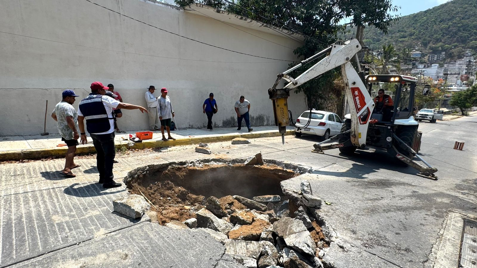 Este domingo, en la avenida Niños Héroes de Veracruz, se atendió un socavón formado en el centro de la vialidad. Con apoyo de maquinaria pesada se llevó a cabo la excavación; posteriormente, en el transcurso del día se efectuará el relleno y la compactación del área intervenida para dar paso a la reposición del concreto hidráulico.