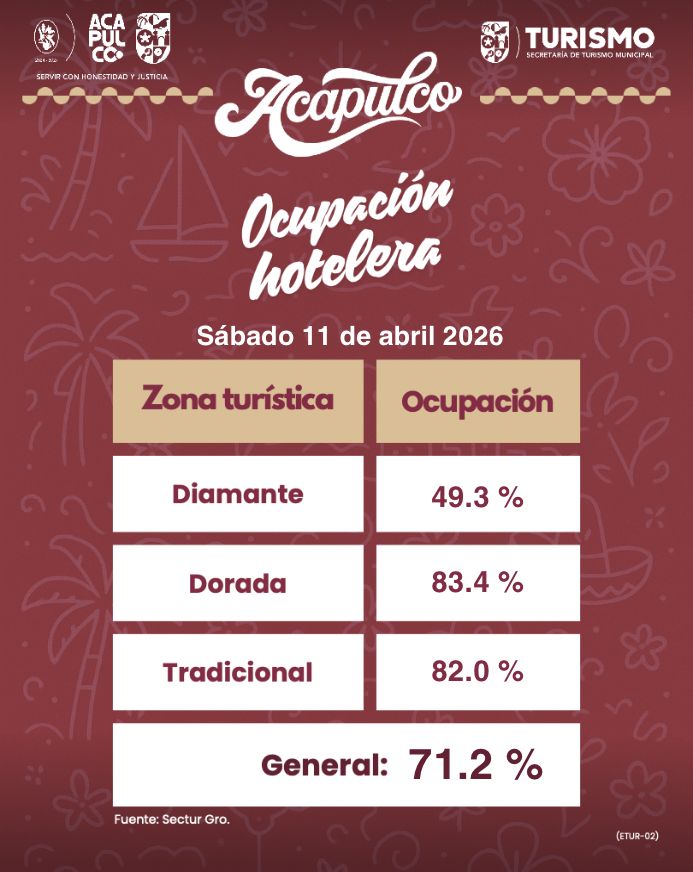 Acapulco, Gro., 11 de abril de 2026.- El último fin de semana del periodo vacacional dejó al puerto de Acapulco con una ocupación hotelera promedio de 71.4 por ciento este sábado, de acuerdo con información de la Secretaría de Turismo.