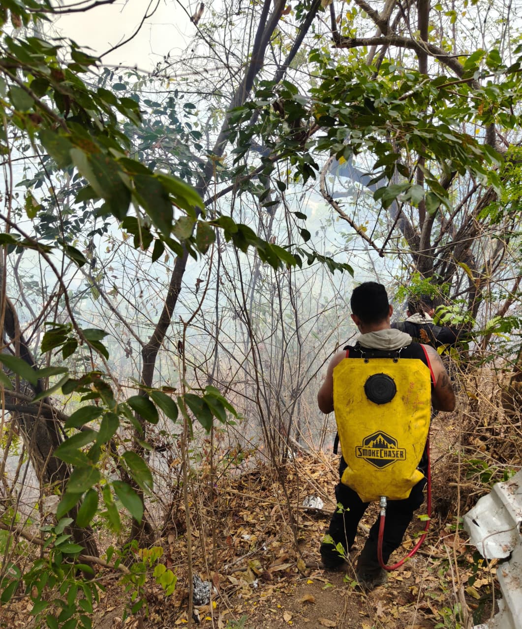 Personal de la Coordinación General de Protección Civil y Bomberos acudió al punto a bordo de las unidades 03, 06 y 58, donde se desplegaron acciones de contención para frenar el avance del fuego y asegurar el perímetro de riesgo.