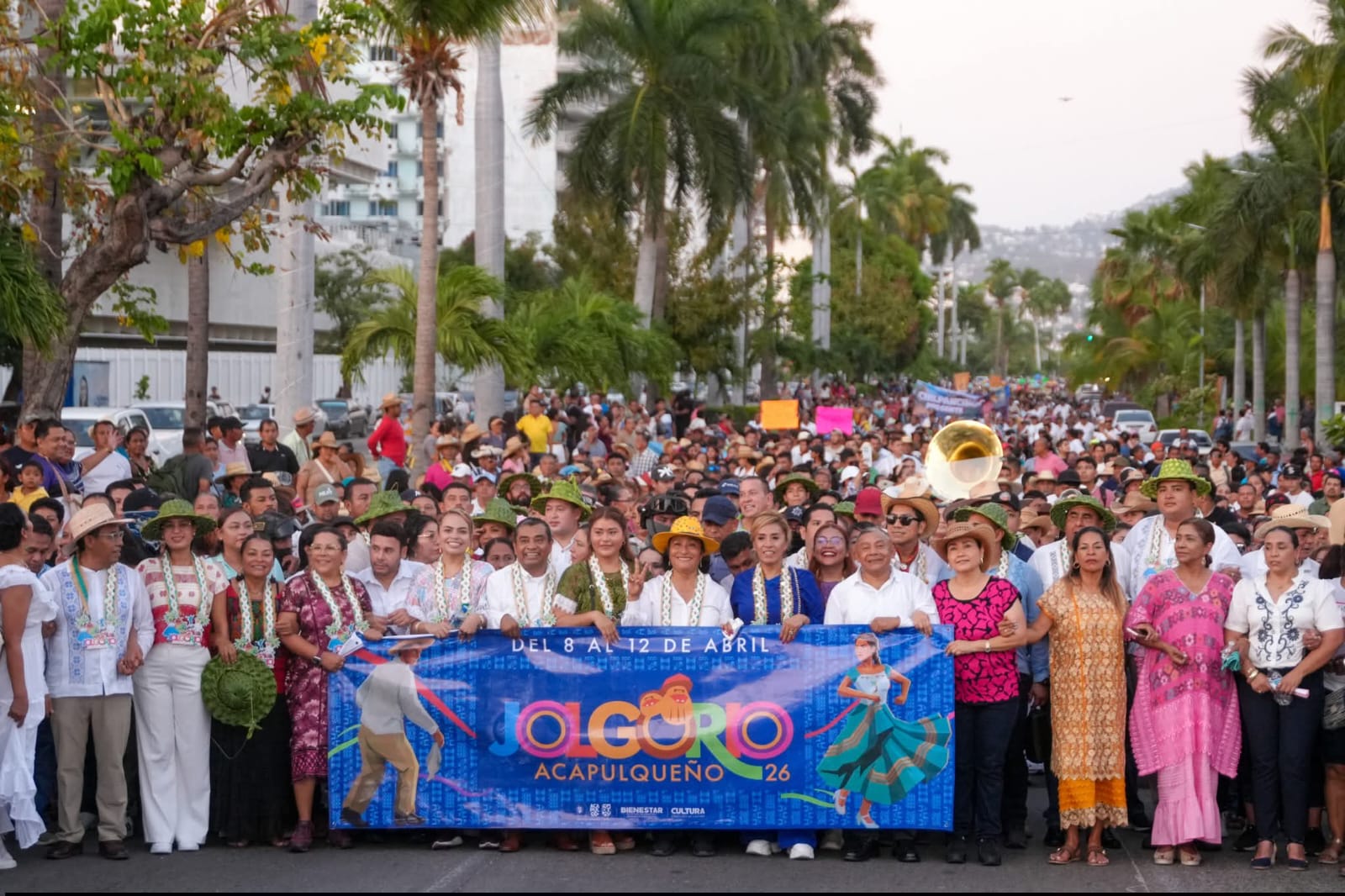 Acapulco, Gro., 10 de abril de 2026.- Danzas, comparsas y música de viento tomaron la avenida Costera Miguel Alemán durante el Paseo de Pendones del Jolgorio Acapulqueño 2026, recorrido que acompañó la presidenta Abelina López Rodríguez ante más de cinco mil personas que se sumaron a esta celebración, que cada año reúne las expresiones culturales más representativas de Guerrero.