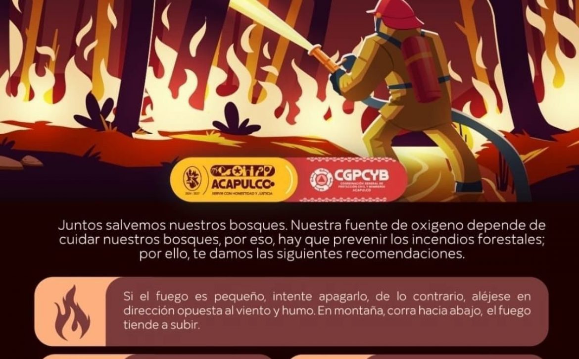 Acapulco, Gro., 11 de abril de 2026.- Ante las condiciones ambientales que favorecen la presencia de incendios forestales, la Coordinación General de Protección Civil y Bomberos emitió recomendaciones para reducir riesgos en zonas de pastizales y áreas con vegetación seca.