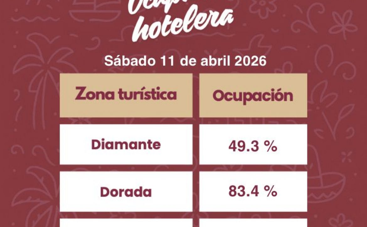 El titular de la dependencia, Noé Peralta Herrera, detalló que la zona Dorada concentró la mayor afluencia de visitantes, con 67 por ciento de ocupación; la zona Tradicional o Náutica registró 62.9 por ciento; mientras que la zona Diamante alcanzó 51.2 por ciento, cifras que confirman el comportamiento del flujo turístico en los principales puntos de hospedaje del destino.