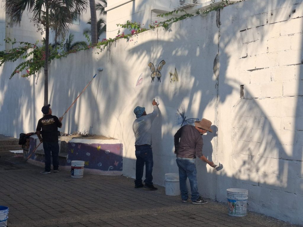 Entre las labores efectuadas en el acceso a playa Elcano se encuentra la aplicación de pintura en jardineras, barandales y luminarias, además del caleo en la barda perimetral. En el acceso a La Playita se intervino el mobiliario urbano con pintura en jardineras, peraltes, muretes, luminarias y estructuras tubulares.