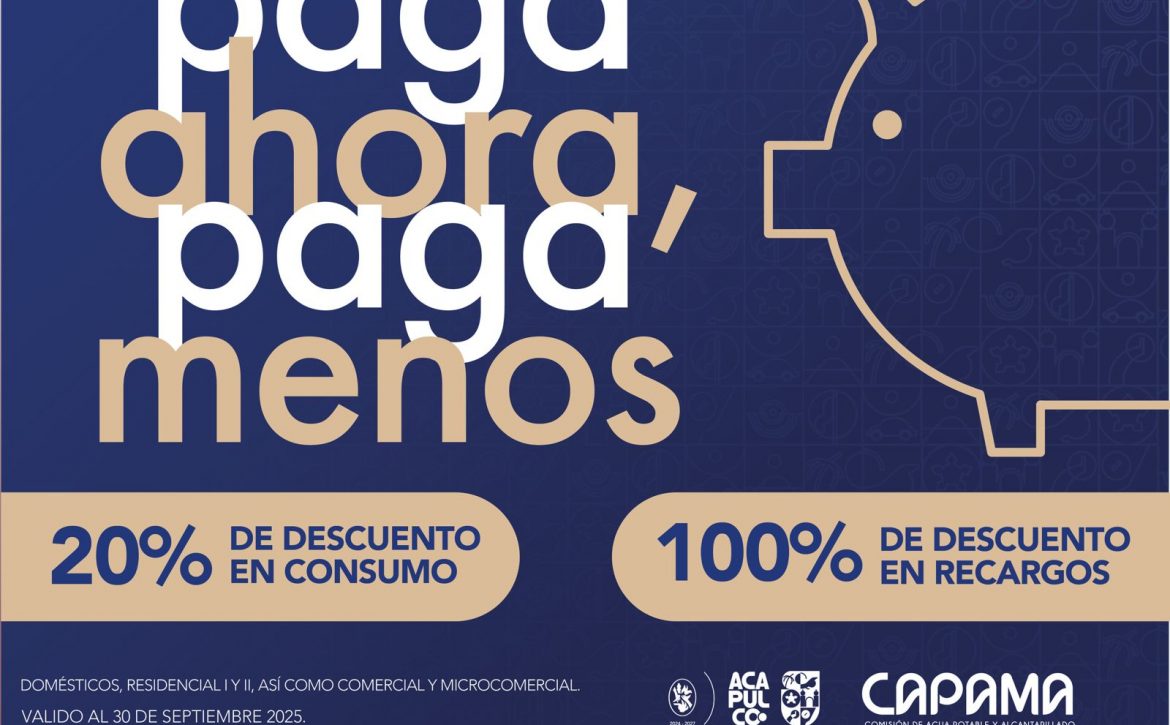 Acapulco, Gro., 18 de septiembre de 2025.- En apoyo a los usuarios con adeudos en los servicios de agua y drenaje sanitario, la Comisión de Agua Potable y Alcantarillado del Municipio de Acapulco (Capama) amplió hasta el 30 de septiembre la campaña de descuentos “Paga Ahora, Paga Menos”.