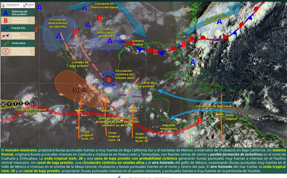 De acuerdo con el Servicio Meteorológico Nacional, la onda tropical número 28 se desplazará sobre el occidente del país, vinculada a una zona de baja presión con probabilidad de desarrollo ciclónico frente a las costas del Pacífico central, ubicada a 325 kilómetros al sur de Lagunas de Chacahua, Oaxaca. El pronóstico indica un 50 por ciento de probabilidad de desarrollo ciclónico en 48 horas y 80 por ciento a siete días.
