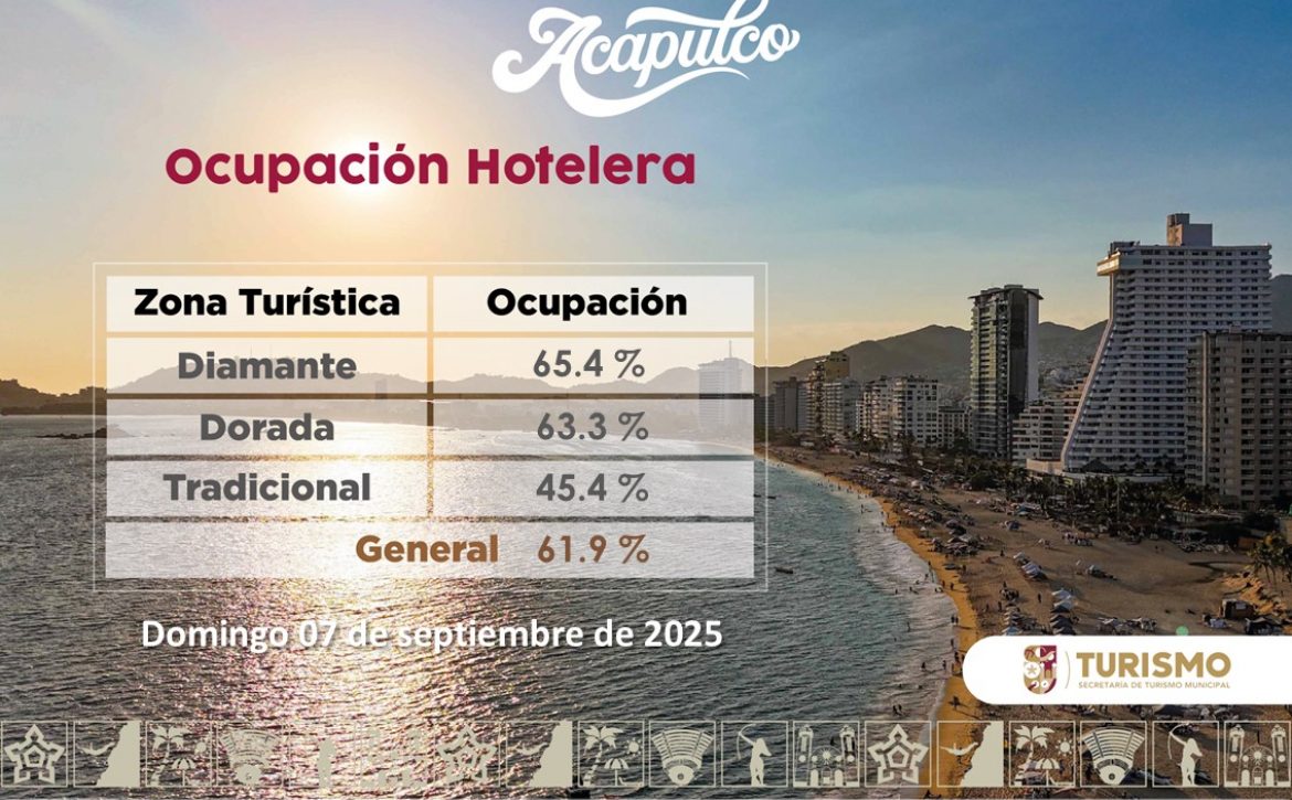 Acapulco, Gro., 07 de septiembre de 2025.- La confianza de los visitantes nacionales y extranjeros en Acapulco se refleja en los niveles de ocupación hotelera registrados durante este fin de semana.