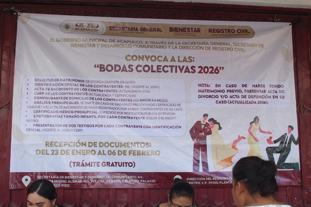Acapulco, Gro., 03 de febrero de 2026.- Formalizar la unión y asegurar la certeza jurídica de la relación es el objetivo de las Bodas Colectivas 2026, un programa que el Gobierno Municipal de Acapulco promueve a través de la Secretaría General, Secretaría de Bienestar y Desarrollo Comunitario y Registro Civil, con atención en dos sedes y un trámite completamente gratuito para los ciudadanos.