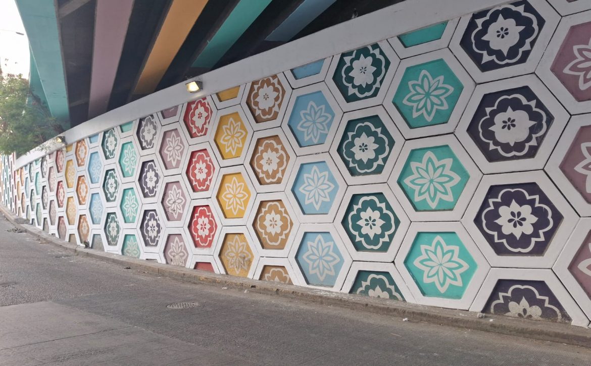 Posteriormente, se aplicó recubrimiento nuevo y se efectuaron retoques en 145.60 metros cuadrados de muros con estructura hexagonal, lo que mejoró la apariencia de la infraestructura.