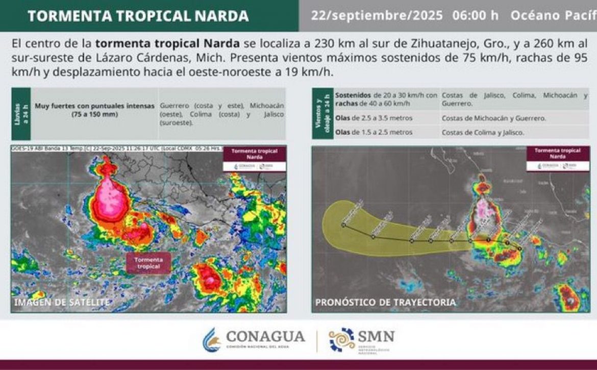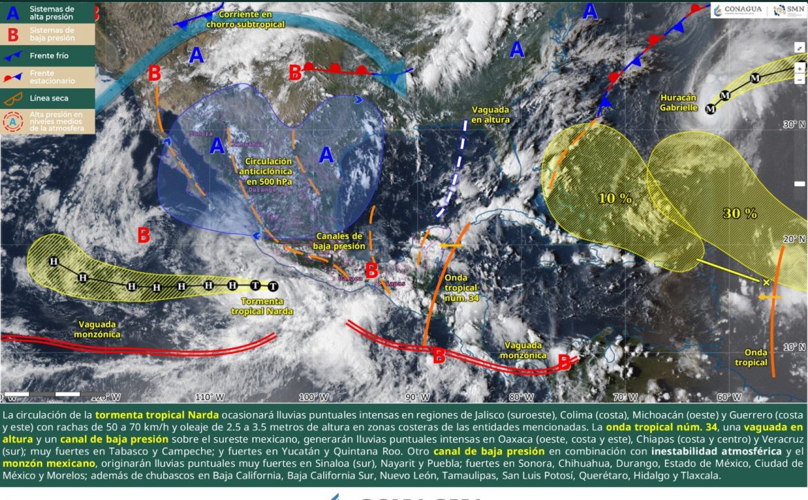 De acuerdo con el reporte vespertino del Servicio Meteorológico Nacional (SMN), las precipitaciones están asociadas al paso de la tormenta tropical Narda, sistema que se fortalece frente a las costas del Pacífico central mexicano. Su circulación ocasionará lluvias intensas en regiones de Jalisco (suroeste), Colima (costa), Michoacán (oeste) y Guerrero (zona costera).