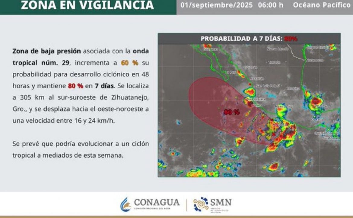 De acuerdo con el Servicio Meteorológico Nacional, la onda tropical número 29, asociada con una zona de baja presión con probabilidad para desarrollo ciclónico y en interacción con una circulación ciclónica en niveles altos de la atmósfera sobre la Mesa Central, originará lluvias y oleaje de 2.0 a 3.0 metros de altura en las costas de Guerrero.
